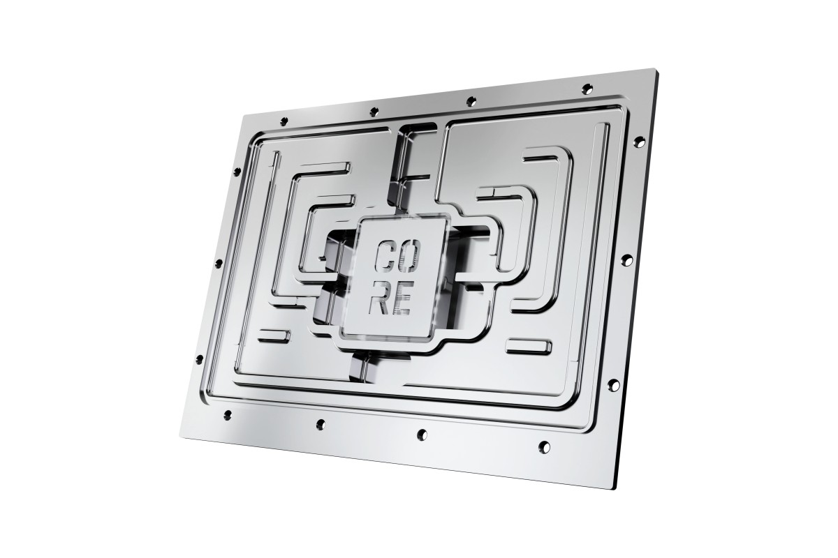 The visual design of the GPU water cooler has only been changed slightly. A special highlight is the newly added Core emblem above the jet plate, which underlines the fact that it belongs to the Core series and visually enhances the design. The series continues to rely on high-quality brass connections that guarantee optimal quality and safety. The specially adapted aluminum backplate covers the entire back of the copper cooler and ensures a clear and uniform look. The acrylic, in combination with the aRGB lighting, enables uniform and impressive lighting of the entire cooler.