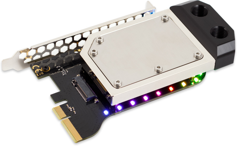 During installation, the SSD is sandwiched between the water block and rear heat sink using thermal pads for optimum heat dissipation. The water block is made from copper, the rear heat sink is made from aluminum and anodized in black color. 17 addressable RGB LEDs can be used for effective lighting effects.