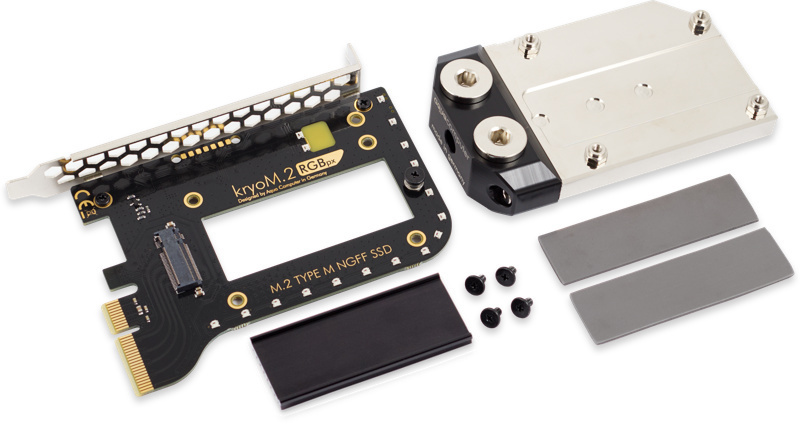 The kryoM.2 RGBpx is a PCIe 5.0 x4 adapter for single sided M.2/M-Key PCIe SSDs and is compatible with the form factor 2280.