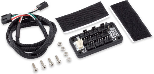 Splitty9 is a universal ninefold splitter and can be used for 3-pin fans, 4-pin PWM fans or as an aquabus splitter.